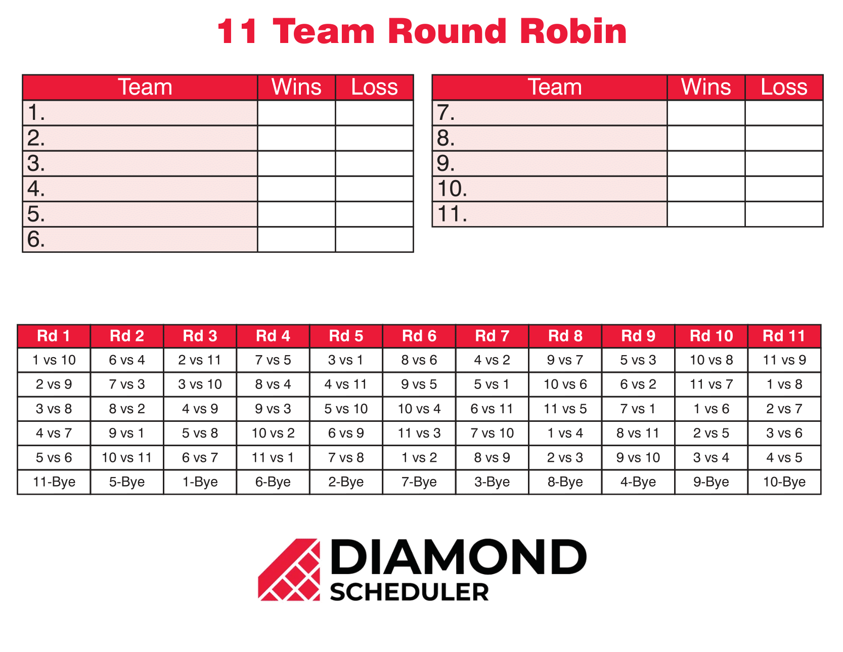 11 Team Round Robin Tournament Printable