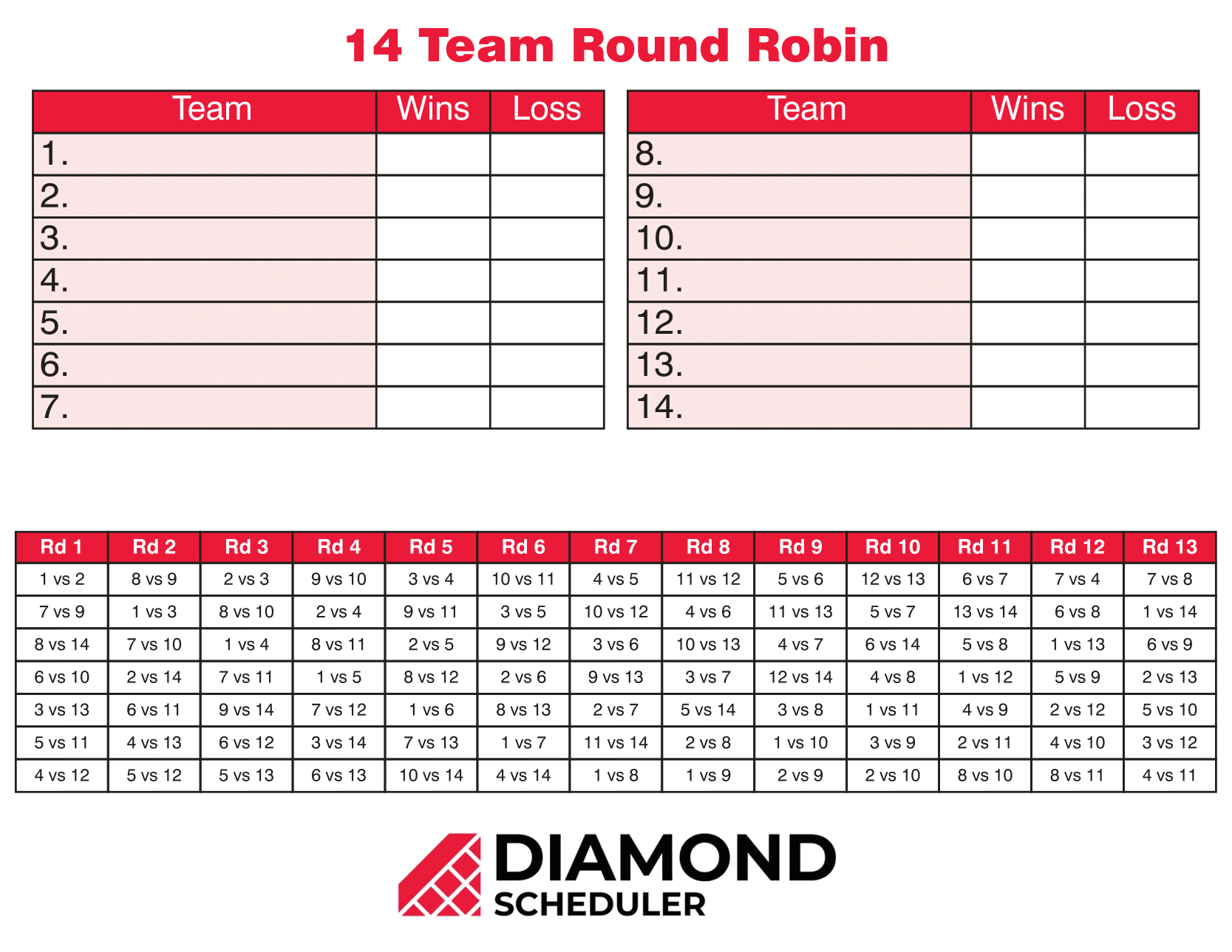 In a 14-team round robin tournament, every team faces every other participant exactly once. Points are awarded based on wins, draws, and losses. At the end, the participant with the most points is declared the winner. This format is great for ensuring everyone gets plenty of playtime and for determining a clear winner based on multiple games.