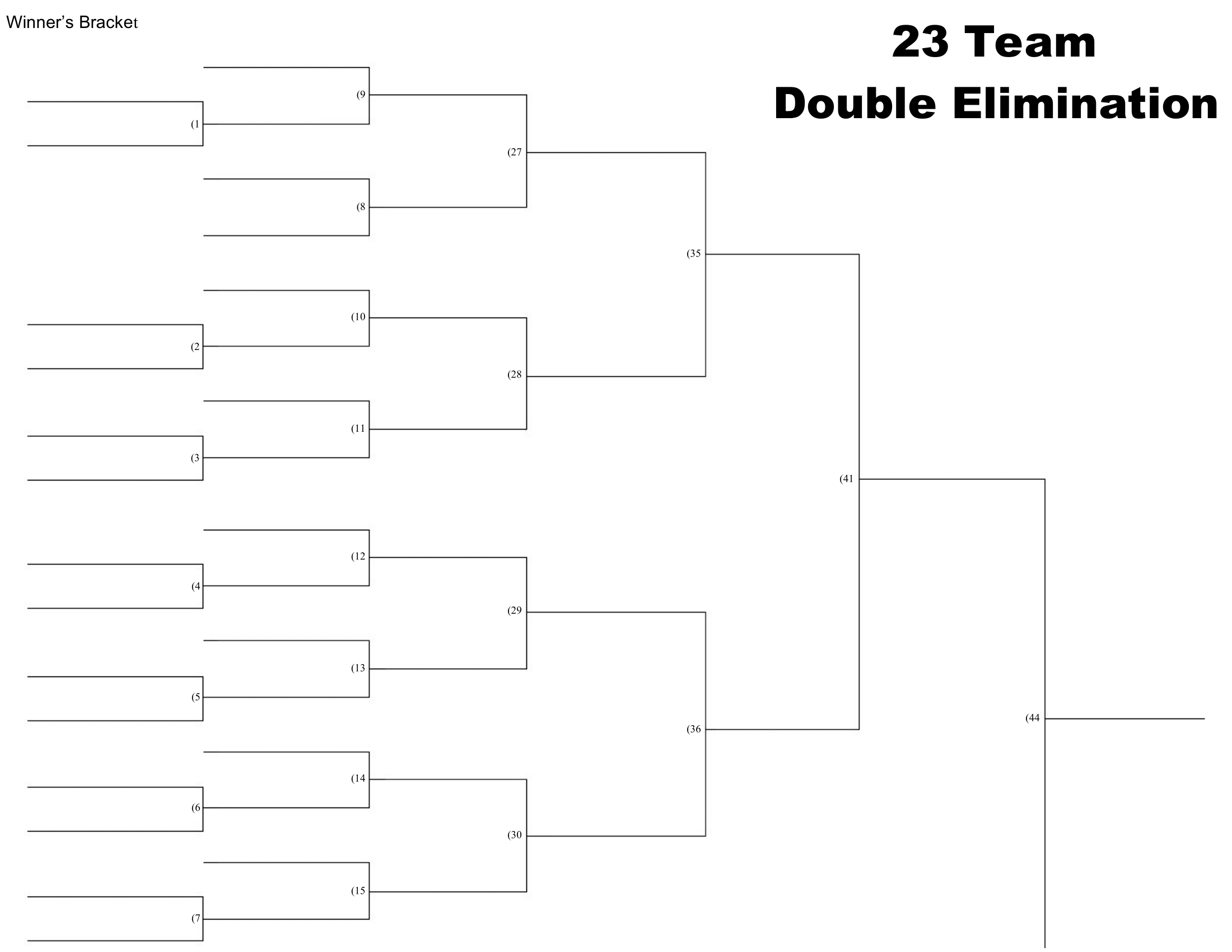 In a 23-team double-elimination tournament, participants have two lives, so to speak. If they lose a match, they're not immediately out; they move to a "loser's bracket." A second loss eliminates them from the tournament. This format allows participants a chance for redemption and makes the competition less susceptible to upsets.