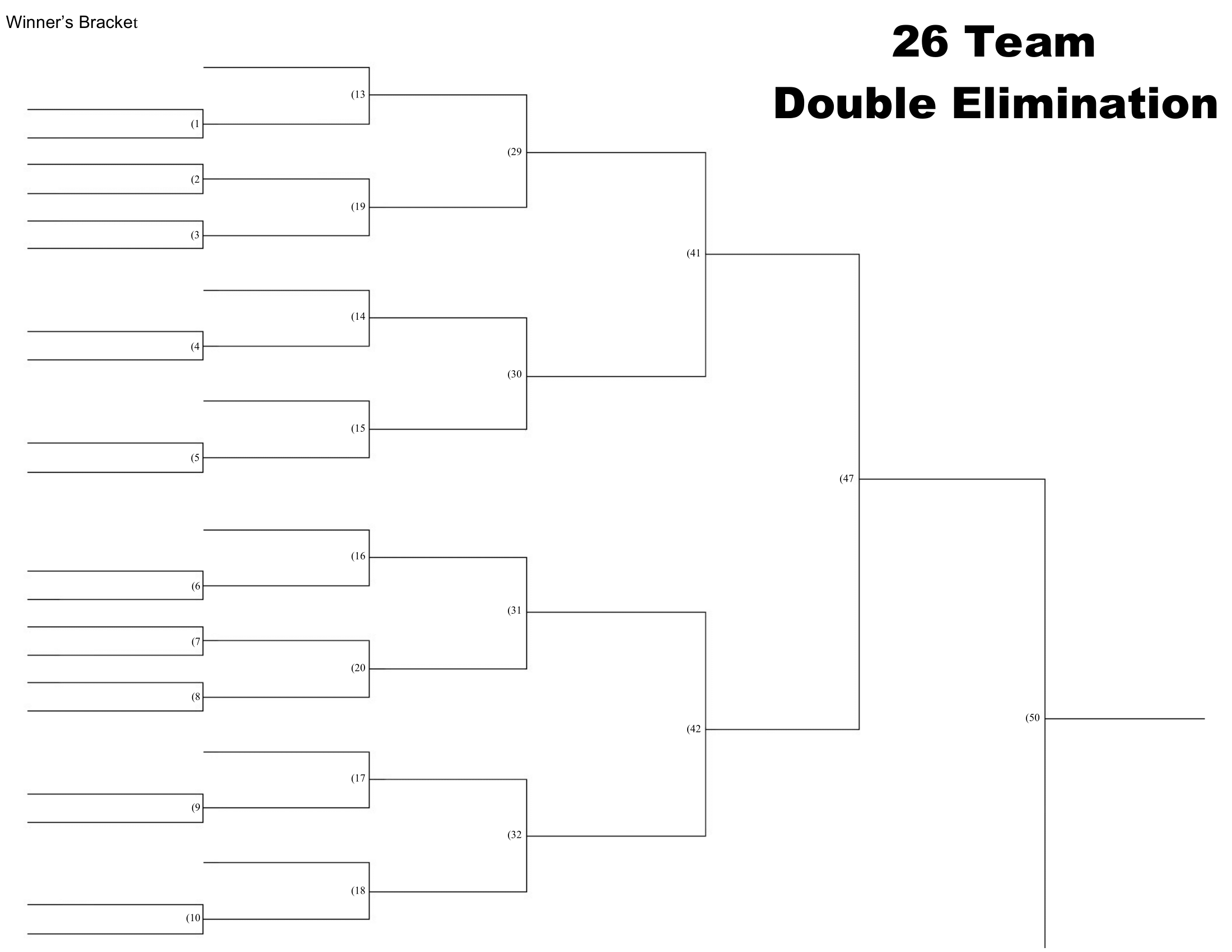 In a 26-team double-elimination tournament, participants have two lives, so to speak. If they lose a match, they're not immediately out; they move to a "loser's bracket." A second loss eliminates them from the tournament. This format allows participants a chance for redemption and makes the competition less susceptible to upsets.