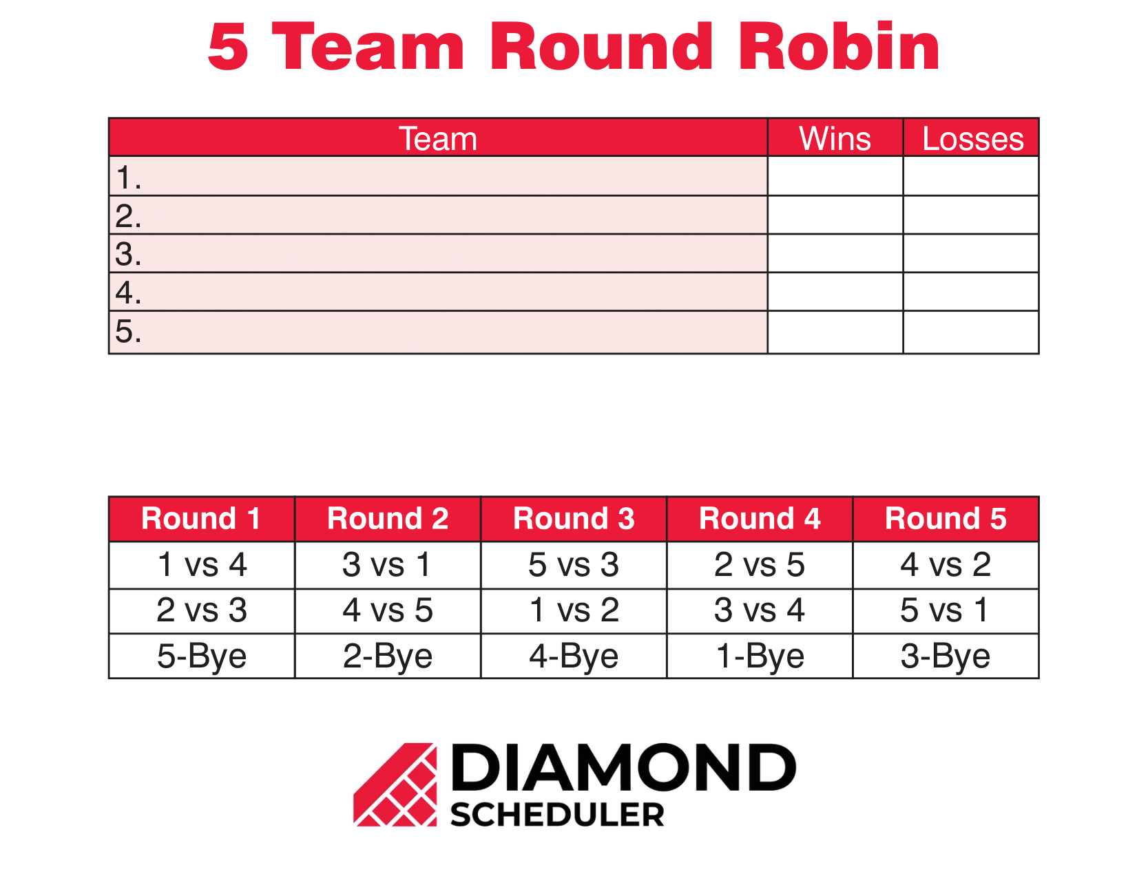 In a 5-team round robin tournament, every team faces every other participant exactly once. Points are awarded based on wins, draws, and losses. At the end, the participant with the most points is declared the winner. This format is great for ensuring everyone gets plenty of playtime and for determining a clear winner based on multiple games.